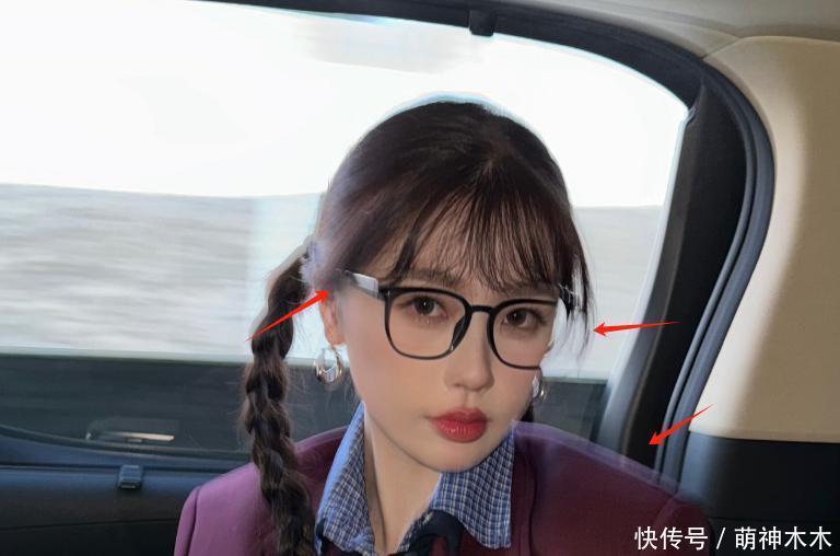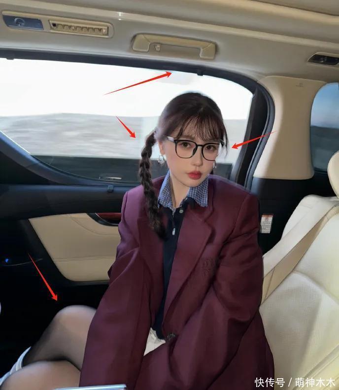 第三处是车窗歪了,头顶上方与右侧都出现了不可比例的弧度。第四处是虞书欣的头与腿的对视觉遵守对比太夸张,头特小,身体特宽。